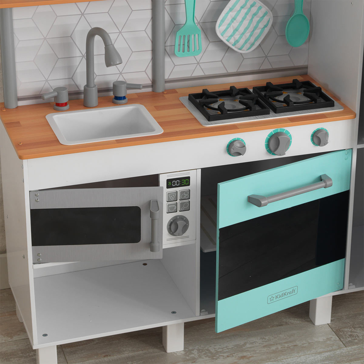 Bucurați-vă de distracția imaginativă pentru bucătarii aspiranți cu bucătarul bucătar gastronomic KidKraft Play Bucătărie cu EZ Kraft Assembly ™! Dispunând de un frigider spațios, cu filtru de joc de gheață, un congelator și un cuptor cu microunde, cu o ușă casetă de prezentare, această bucătărie modernă are tot ce bucătari gourmet au nevoie pentru a face distractiv mealtime delicios. Trei butoane interactiv clic pe atunci când arderea cuptorului extra-mare și aragaz cu capota de ventilație șic. Tinerii pot învăța abilități practice pe măsură ce se joacă cu mânerele etichetate cu roșu și albastru al chiuvetei pentru a indica apa caldă și rece. Inclus lingura, spatula și titularul oală au propriile lor cuie suspendate deasupra sobei, și spațiul raft deasupra chiuvetei face ca invatarea de a organiza distractiv și ușor. Cu KidKraft Gourmet Chef Joaca Bucătărie cu EZ Kraft Adunarea ™, copiii sunt obligați să creeze amintiri gustoase ca acestea sunt transformate în bucătari mici. Parintii se vor bucura cat de repede si usor este sa asambleze aceasta bucatarie cu tehnologia inovatoare EZ Kraft Assembly ™, ceea ce inseamna mai putin timp de construire si mai mult timp de joc!