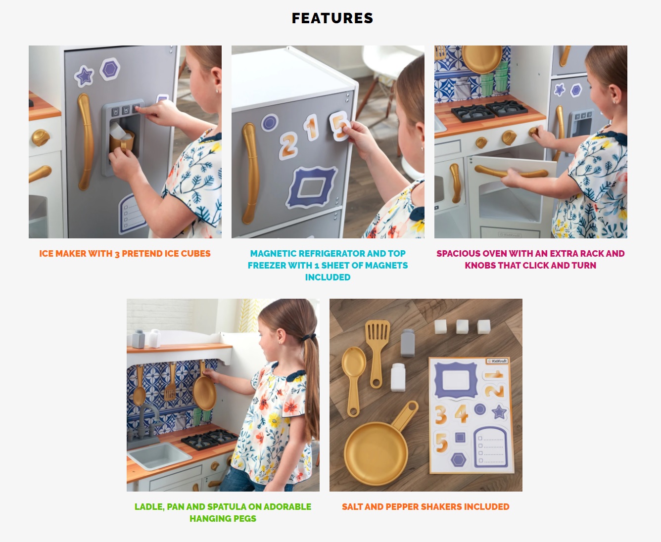 Joaca cu aceasta bucătărie KidKraft Mosaic Magnetic Kitchen Kitchen tocmai a devenit mult mai gustoasă, emoționantă și la modă ! Bucurați-vă de distracție pentru bucătarii mici, cu această bucătărie joacă deosebită, care este dotată cu detalii excepționale și caracteristici delicioase, inclusiv un frigider magnetic cu congelator de top, astfel încât copiii să poată decora cu magneți sau să pună la dispoziție liste de cumpărături. Nimic nu este mai răcoros decât producătorul de gheață de lucru care distribuie cuburi de gheață din plastic! Când copiii vor fi pregătiți să aprindă aragazul sau cuptorul, vor fi încântați să afle că butoanele fac un sunet distractiv dând clic când sunt întoarse. Deoarece creațiile culinare sunt la cuptor sau cuptor cu microunde, copiii pot arăta cu mândrie tatălui și tatălui ceea ce fac prin ușile vitrinei! Cu un set accesoriu format din 6 bucăți, o chiuvetă spațioasă și un design adorabil al gospodăriei, KidKraft Mosaic Magnetic Play Kitchen este un plus perfect pentru dormitorul echipat de joacă pentru micutii bucătari!