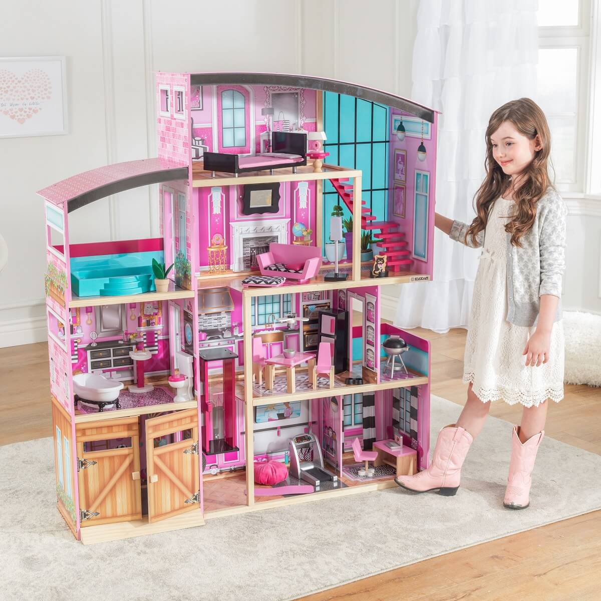 KidKraft Shimmer Mansion este locul perfect pentru imaginația tinerilor să își tese propriile povesti. Casa de păpuși luminoasă, cu patru niveluri, are o înălțime de peste 135 metri și este detaliată.