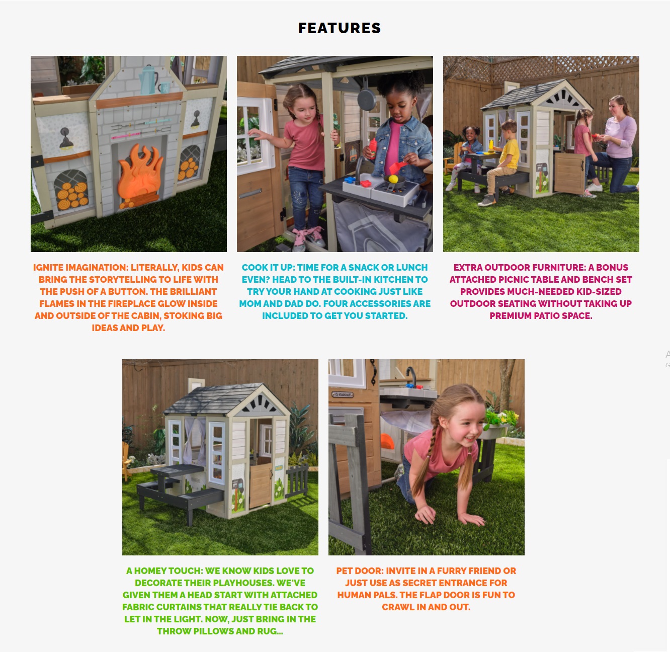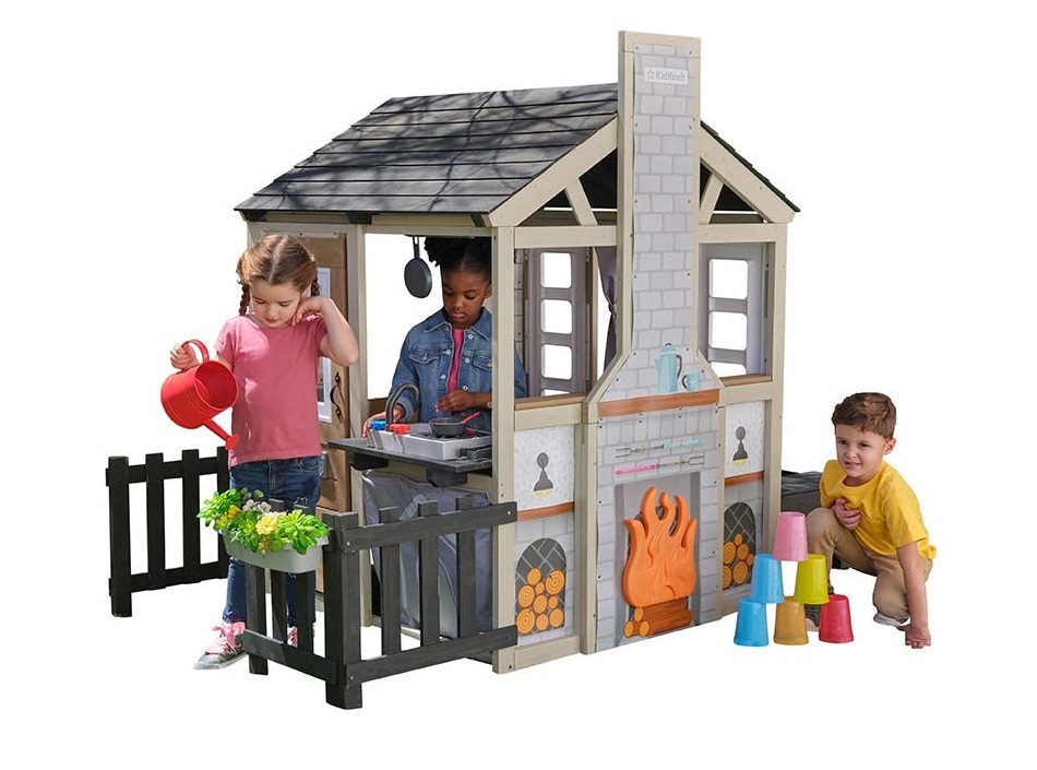 La fel ca și adulții, și copiii visează să dețină acea evadare de cabană ciudată. Casa de joacă KidKraft Cozy Hearth Cabin permite experienței de glamping să prindă viață, chiar în confortul propriei curți. Cabana lor în stil vacantă se mândrește cu un coș de fum impresionant de înalt, cu o piesă centrală magnifică a flăcării în șemineu care se luminează cu adevărat. Doar „alimentează” focul cu o apăsare de buton și acesta prinde viață, încălzind aspectul întregii experiențe de joc. Realismul este exprimat și mai mult prin grafica colorată a stivelor de lemne de foc și mantaua afișând o cană primitoare de cacao fierbinte aburindă, poate? Copiii se vor bucura și mai mult de a găti în bucătărie cu oala, tigaia și ustensilele furnizate. Serviți mesele afară, pe masa atașată și setul de bănci, astfel încât să vă puteți bucura de priveliște. Cu trei intrări (față, spate și uși pentru animale de companie), această casă de joacă din lemn va oferi cu siguranță și o mulțime de joacă activă. Rezervați-vă acum pentru a petrece mult timp creând amintiri în Casa de joacă Cozy Hearth Cabin.