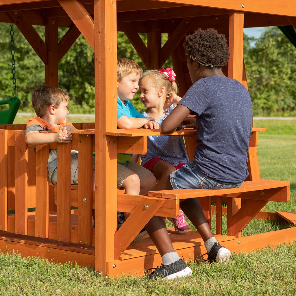 De la bătălii de dragon la petreceri cu ceai, Skyfort Wooden Swing Set II va ridica la cer imaginația copiilor dvs. și peisajul. Cu clubul său însoțit de soare, verandă spațioasă și cuib de cocos complet dotată cu propriul telescop, această plajă proeminentă se va simți ca propriul castel din lemn. Există o mulțime de căi distractive și sigure de a vă deplasa în jurul acestui palat personal: barele de maimuțe cu lungime întreagă leagă-le direct în clubhouse, un stâlp de stâncă provocator le permite să urce direct pe pridvor și un tobogan de 304,8 cm aventurierii tineri îi alunecă înapoi. Aveți nevoie de o pauză pentru a vă proteja fortăreața? Stabiliți-vă pe un leagăn relaxant sau luați o gustare la masa de picnic. După aceea, sa întors la guvernarea regatului lor!