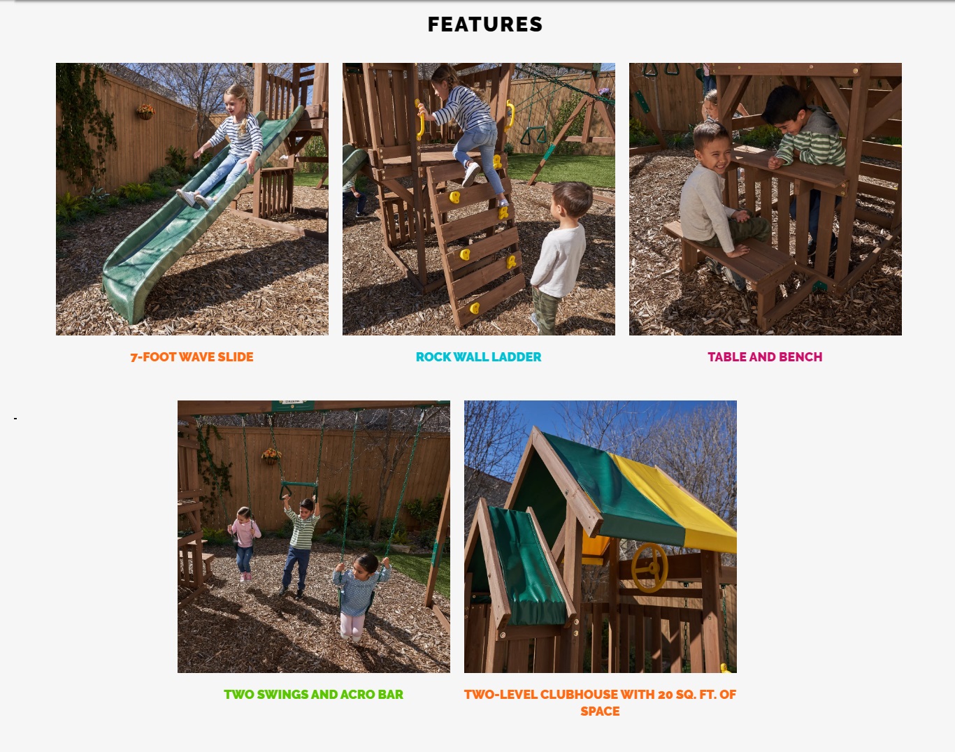Complexul de joaca Arbor Crest Playset este dispus pe 2 niveluri si poate sustine pana la 6 copii energici cu greutate de pana la 50 de Kg fiecare pentru a-l utilizeza in acelasi timp. Este fabricat in totalitate din lemn de cedru premium, ceea ce transforma acest spatiu de joaca intr-o minune durabila si impozanta. De asemenea, lemnul este pre-taiat, pre-gaurit si colorat non toxic.