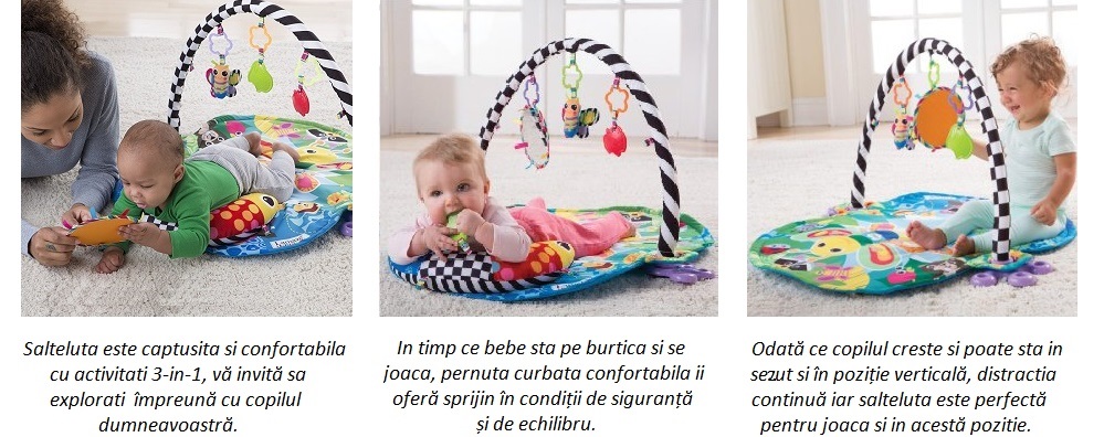 Salteluta Freddie Licuriciul este un centru de activitati 3 in 1, care oferă trei poziții diferite de joaca, pentru trei etape de dezvoltare.