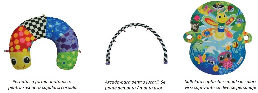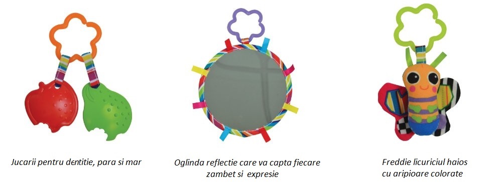 - Spatiu de joaca tematic include jucarii amuzante si o jucarie de dentitie, usor detasabila, care ii va face sa zambeasca pe cei mici.