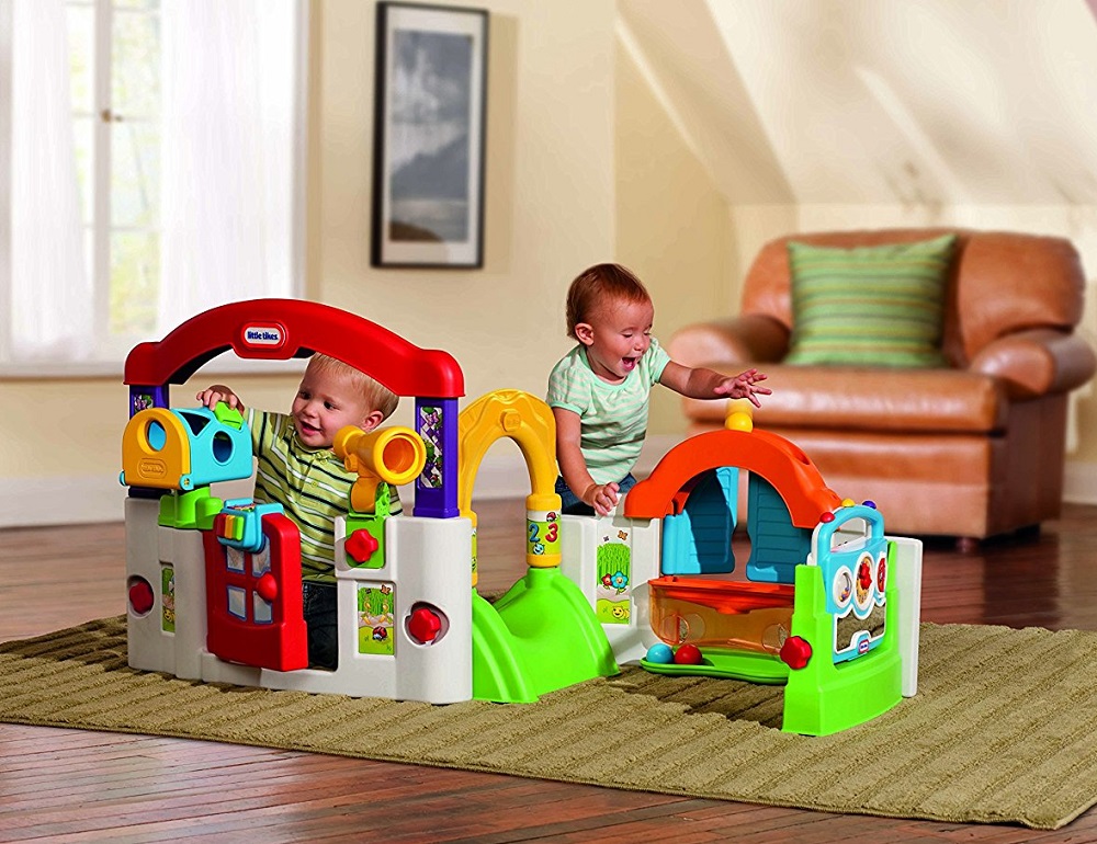 Centrul de joaca Little Tikes se transformă cu ușurință dintr-un centru de joacă închis intr-o sală de sport pentru joaca, deschisa, cu două fețe, fara a fi nevoie de unelte pentru aceasta operatie.