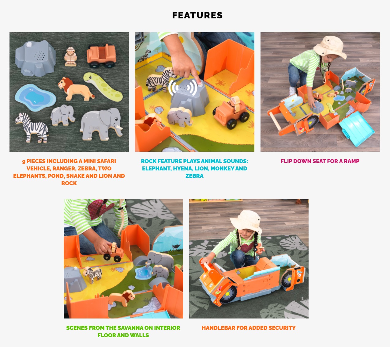 Fii pregătit pentru aventură - fie acțiune, fie imaginativ - cu KidKraft Safari 2-in-1 Ride and Play. La prima vedere, această jucărie de călătorie este un mod interesant pentru copii de a se deplasa prin casă, dar când deschideți scaunul, veți descoperi o altă lume! Un set de piese cu scene complet detaliate și o turmă de animale de călătorit este gata pentru jocul de credință. Apăsați butonul de pe bolovanul de piatră pentru a auzi sunete de animale. Folosiți scaunul ca o înclinație pentru ca animalele să urce pe munte. Când timpul de joacă s-a încheiat, pur și simplu stocați piesele înăuntru, închideți părțile laterale și continuați cursa de safari. Safari 2-in-1 Ride and Play este modalitatea ideală pentru copii de a combina abilitățile de învățare motorie brute și fine pentru o aventură plină de acțiune.