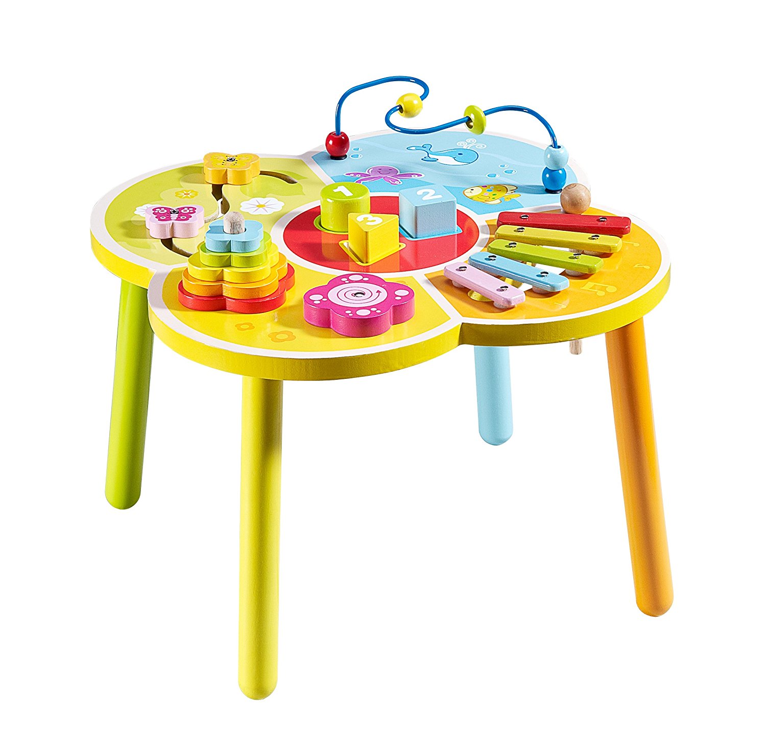 - Masa mai este prevazuta cu: piese din lemn care se invart, xilofon, un ax cu cinci bilute colorate, cinci flori de diverse marimi si culori
