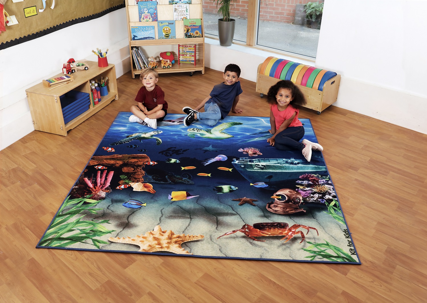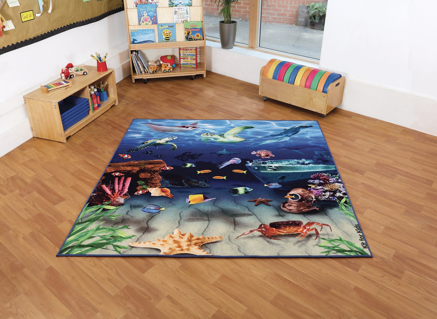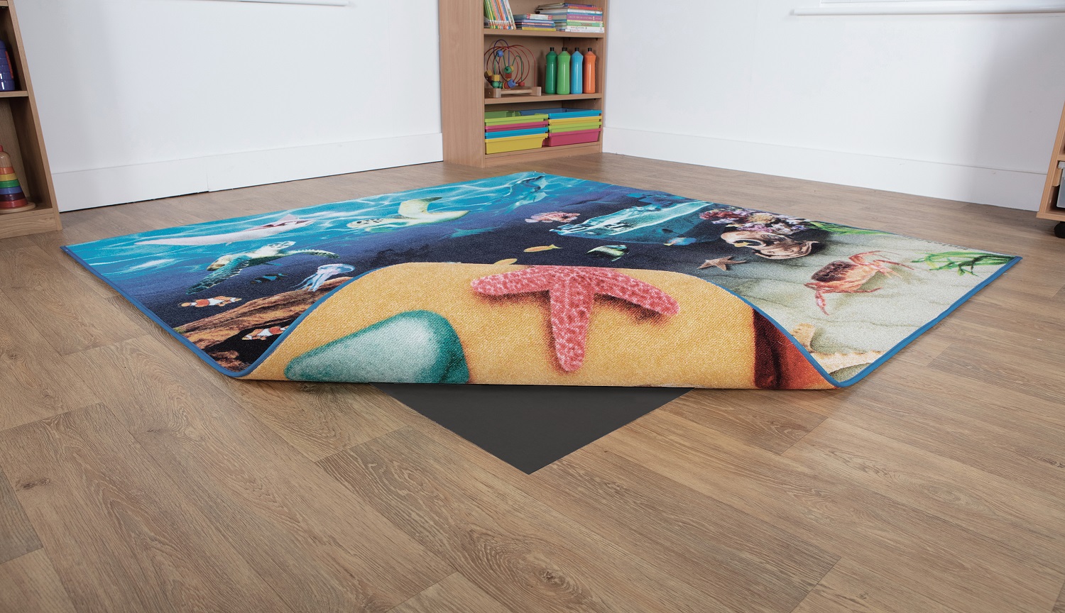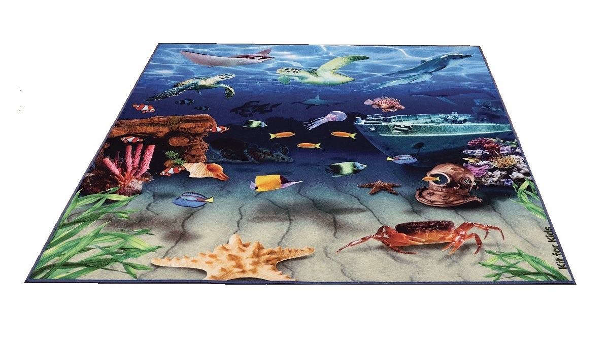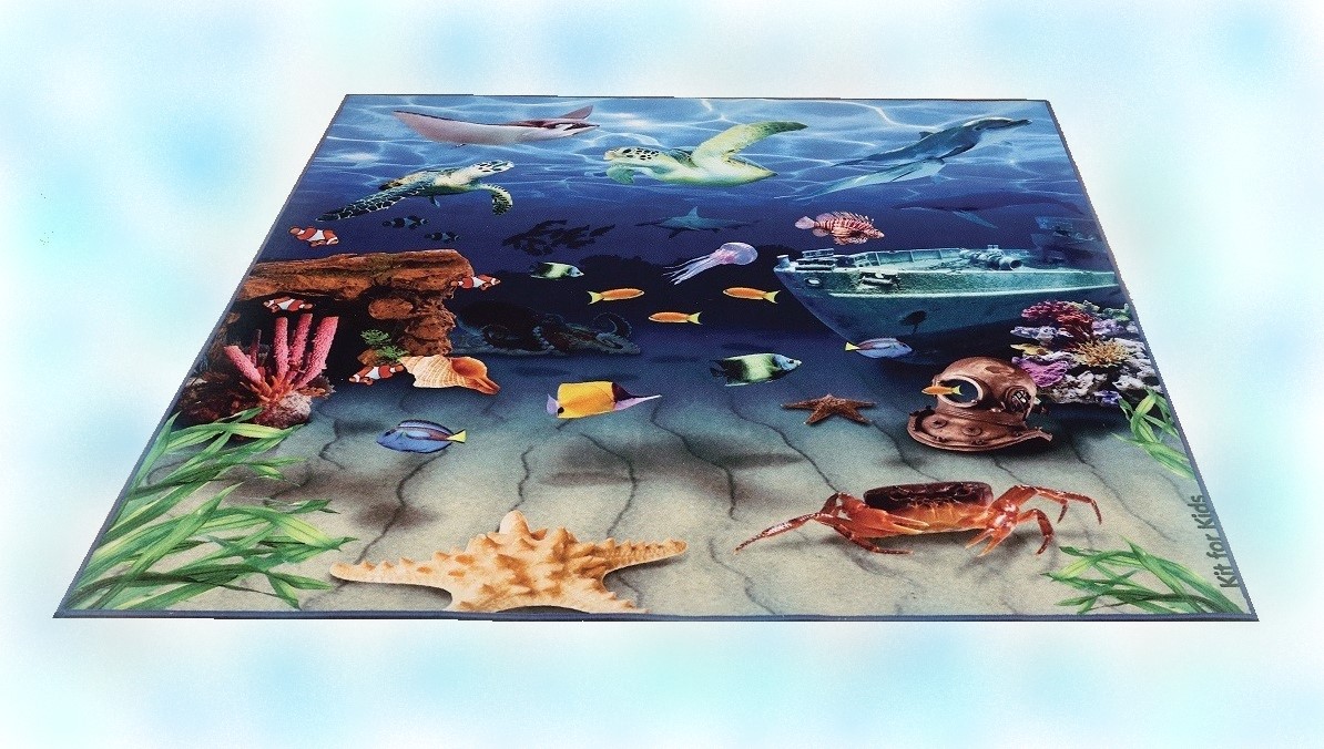 Un covor versatil 2 in 1, ideal pentru cei mici cu o tematica marina cu pesaj subacvatic si cu o coloristica vibranta, relaxanta si recreativa