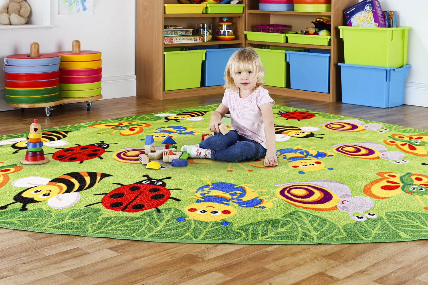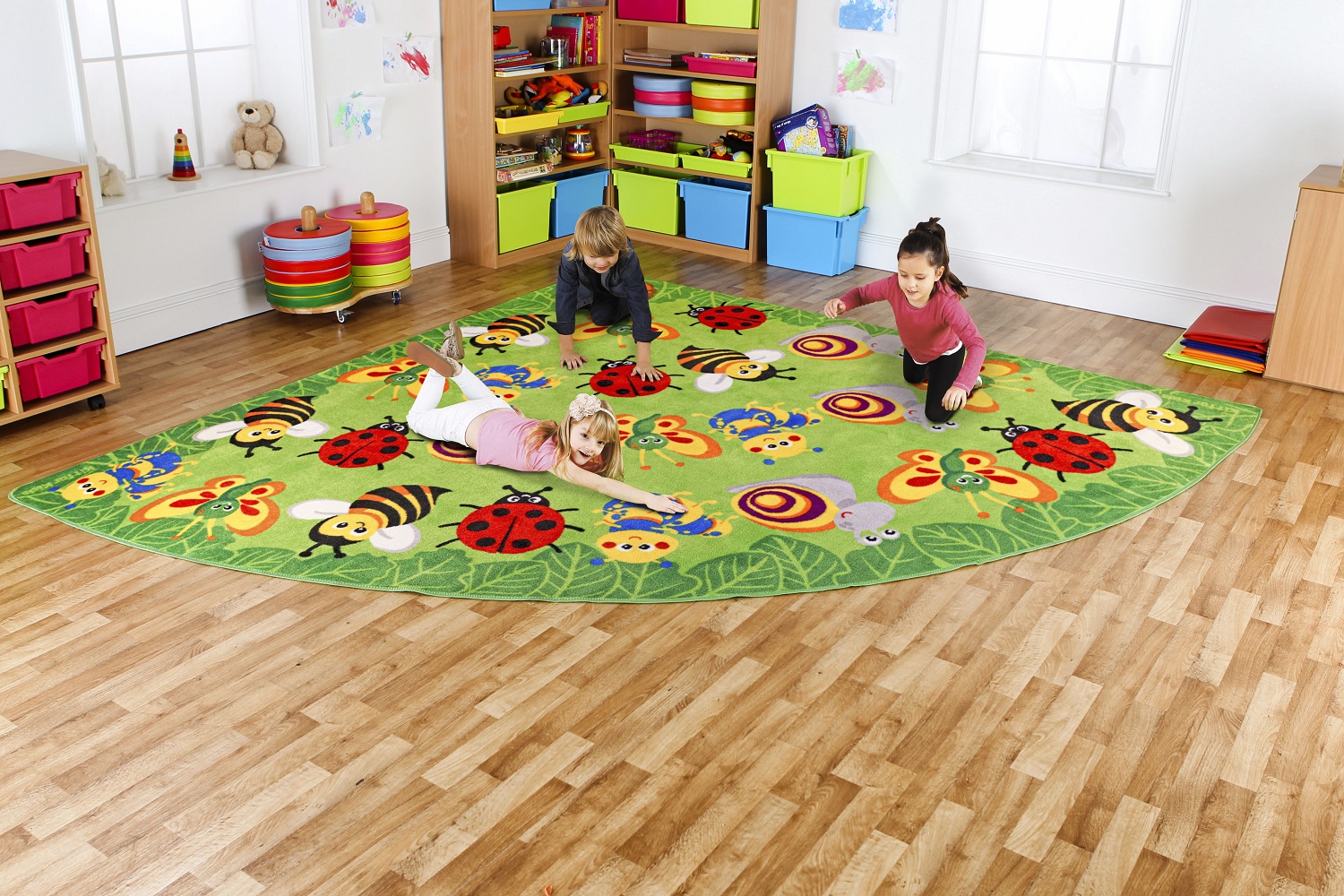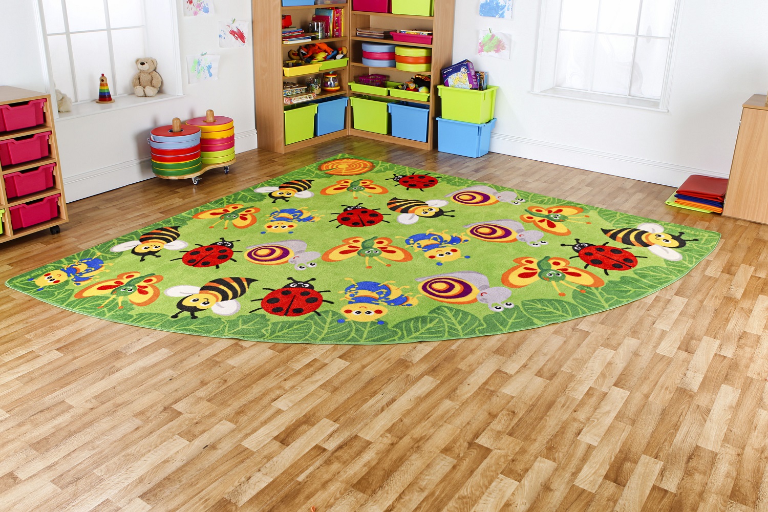 Covor de dimensiuni medii de 3 x 3 m, cu zone de relaxare pentru plasarea micilor creaturi cu insecte dragalase clar identificabile pentru un grup de dimensiunea primară de până la 24 copii plus o zonă pentru profesor educator.