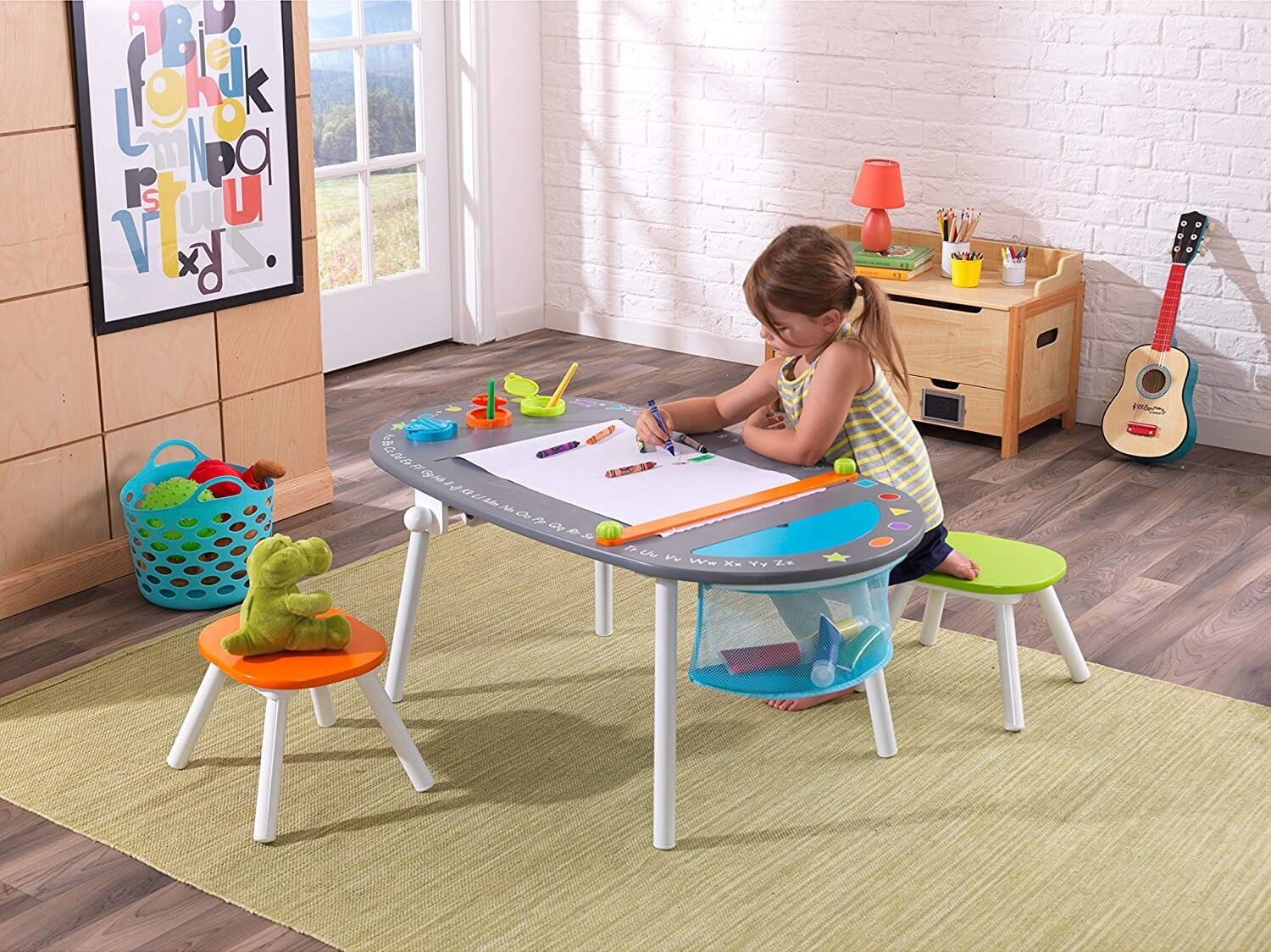 Chalkboard Art Table – Kidkraft cu taburete va fi centrul creativ al oricarei camere de joaca. Un rulou de hartie de arta se monteaza sub masa, se alimenteaza printr-o fanta si se fixeaza pe o suprafata de lucru sigura. Un trio de pahare cu vopsea bine sigilata impotriva scurgerilor, pastreaza vopsea proaspata . Un compartiment de stocare cu ochiuri de plasa pastreaza consumabilele, astfel incat micii artisti isi pot pastra spatiul de lucru curat. Masa este acoperita cu tabla acopera asigura un aspect elegant iubit deopotriva de copiii si parinti.