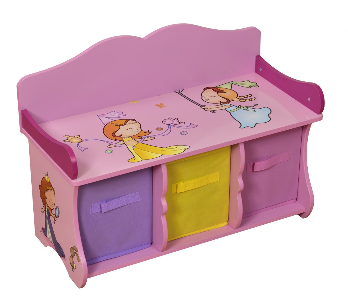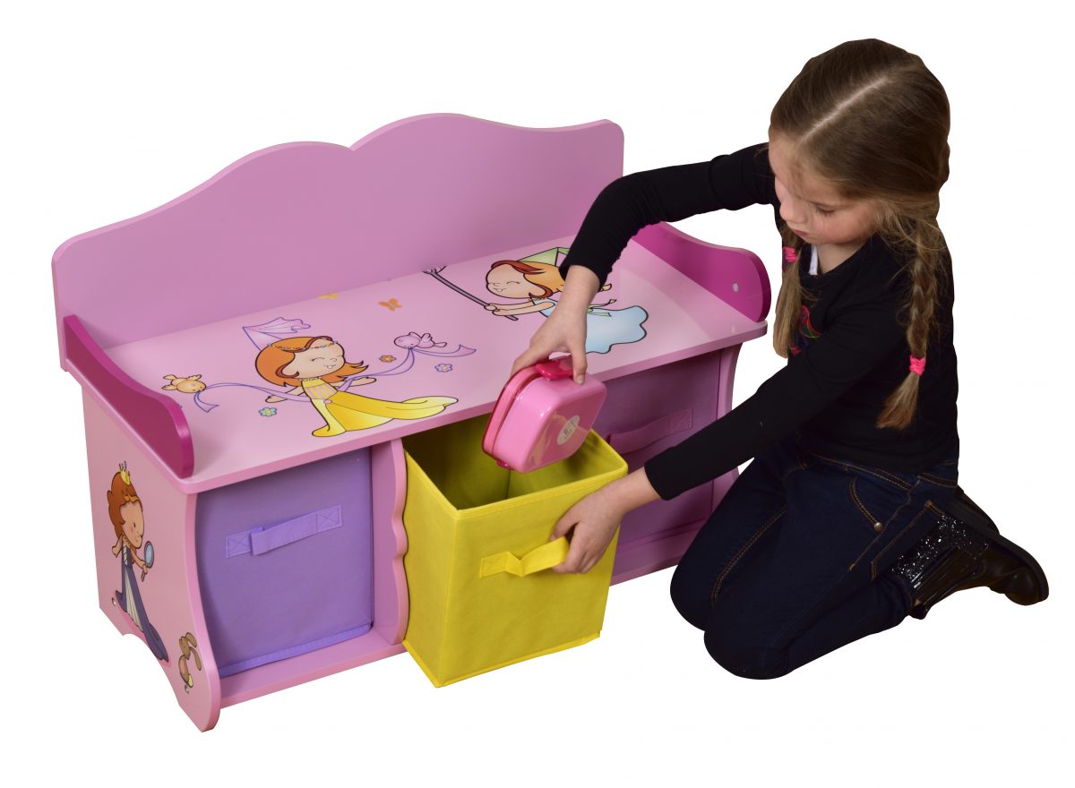 - Prințesele noastre prietenoase cu animalele vă vor încânta fetița pe această bancă utilă de depozitare.