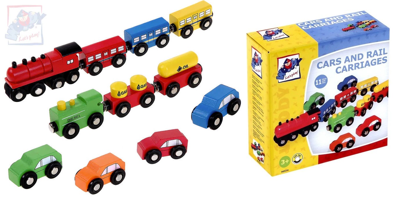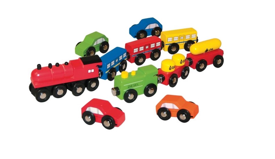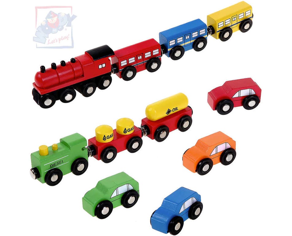 Produs: Set 3 in 1 cu Trenulete Locomotive Vagoane de Calatori si de Marfa plus set masinte din lemn cu cuplaj magnetic
