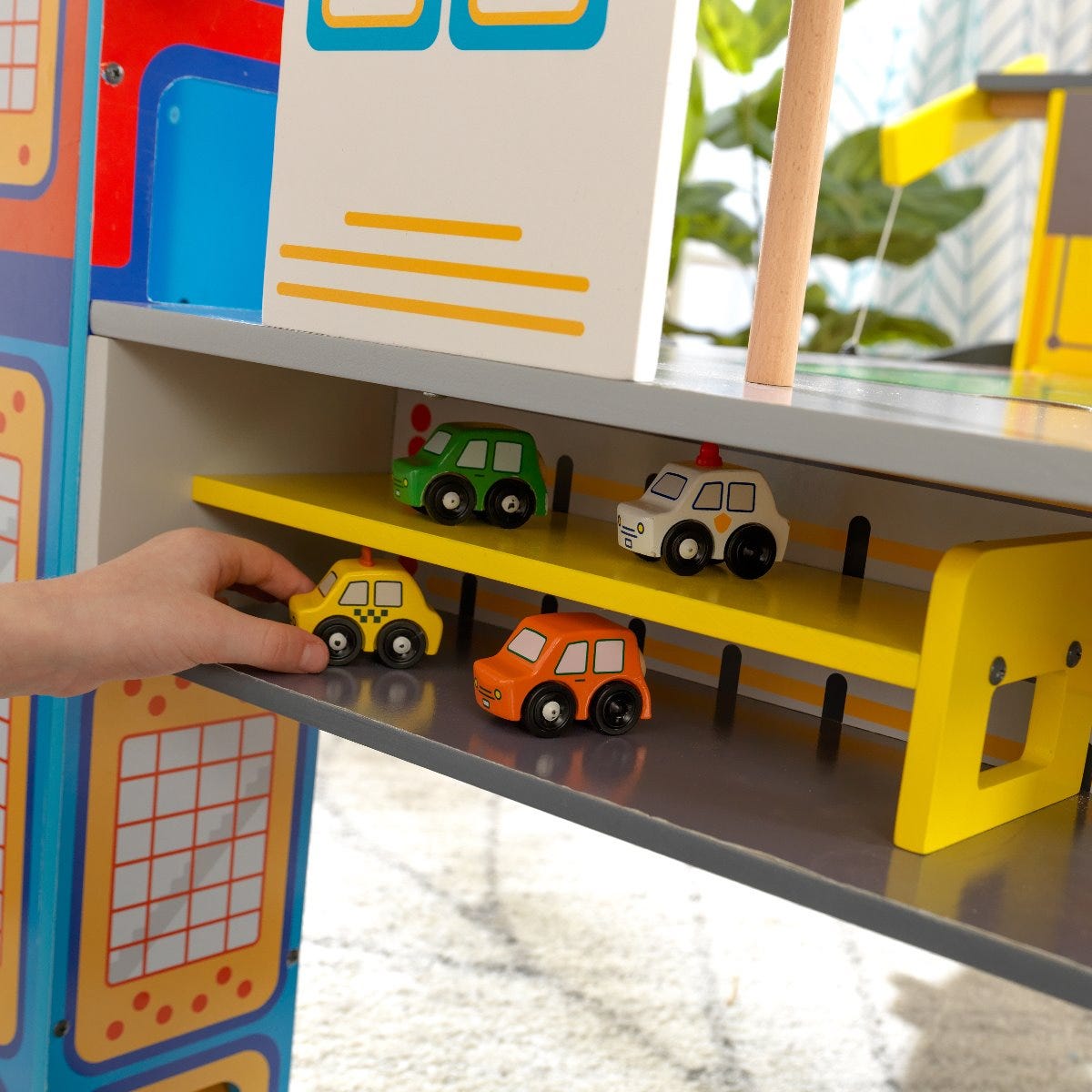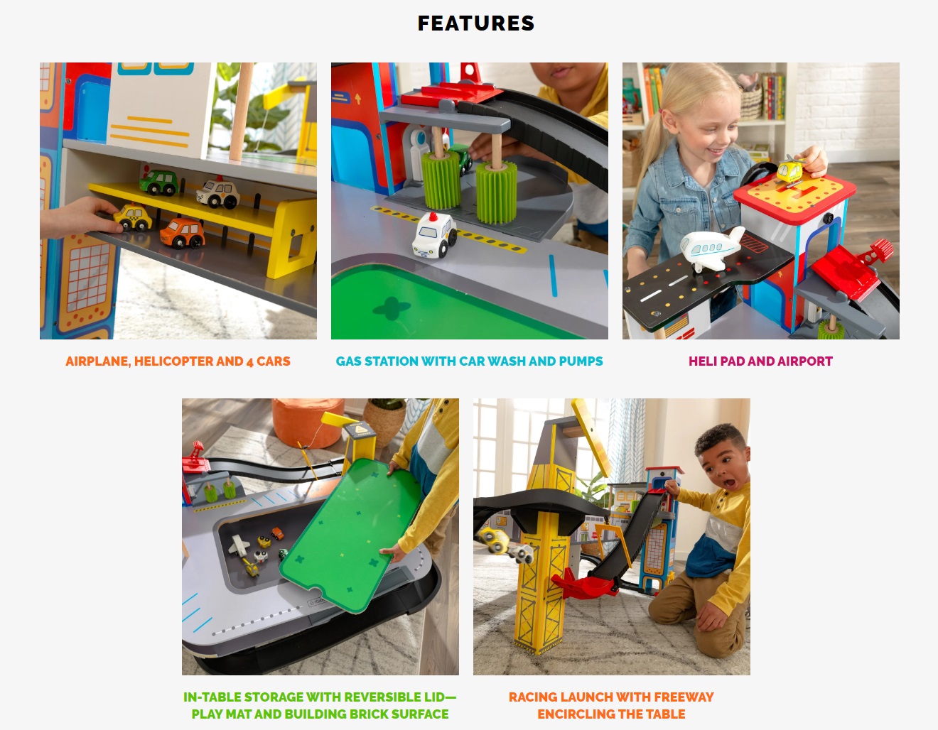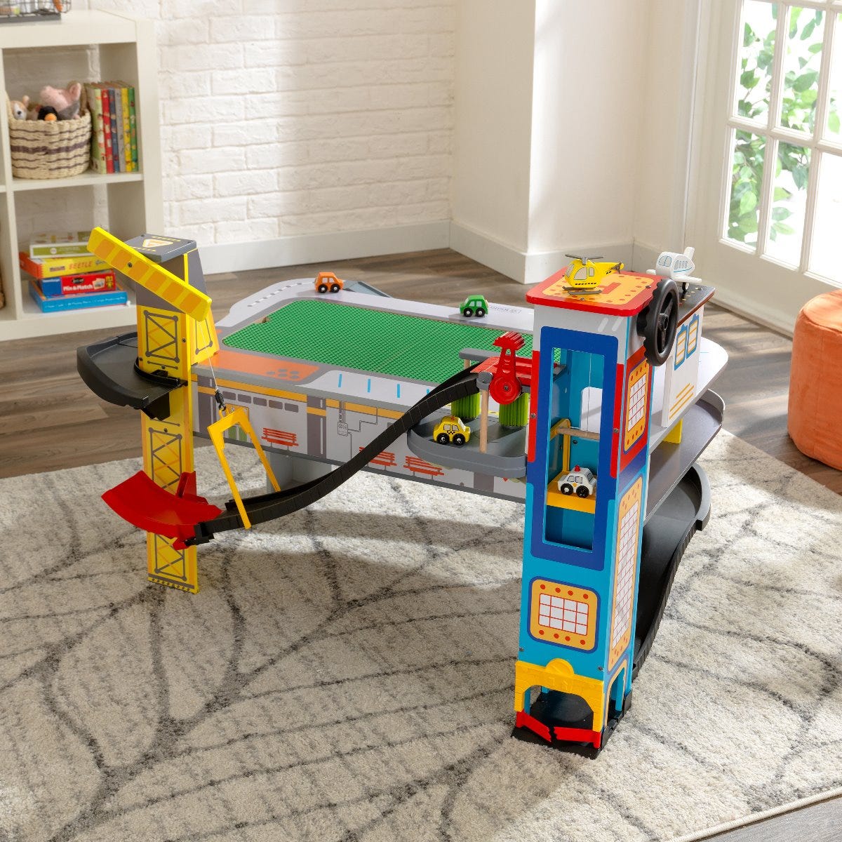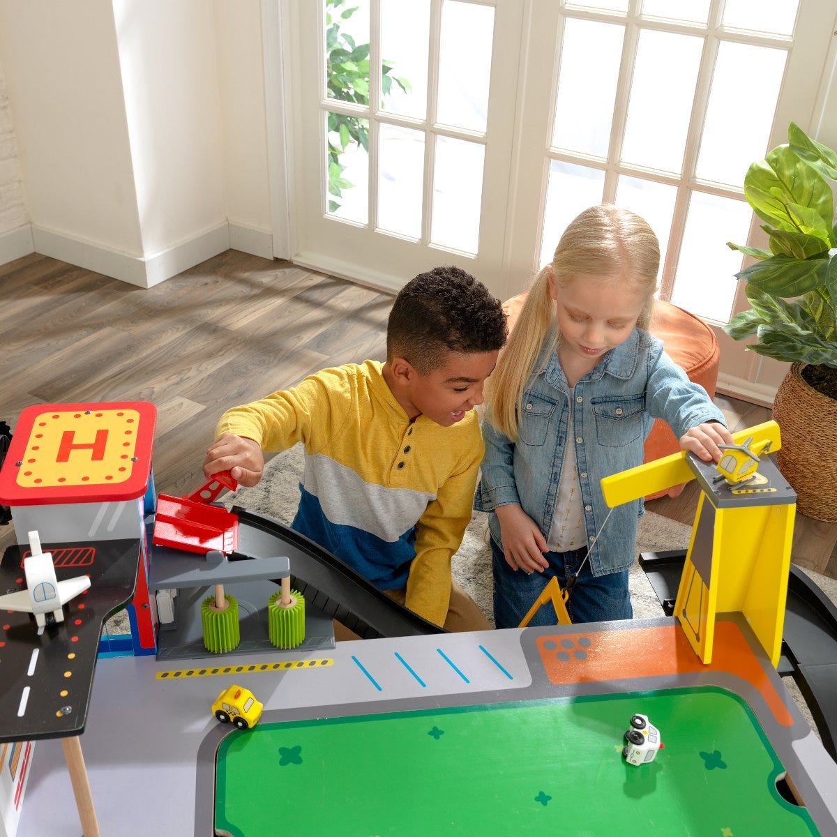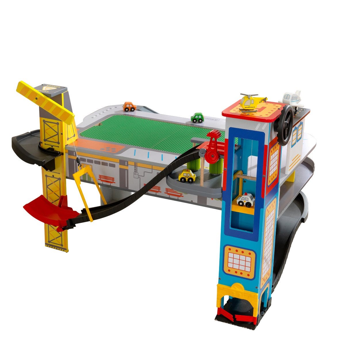 Set Masuta Pista de Curse cu Masinute si Rampa de Viteza - cu lift garaj lego Freeway Frenzy RaceWay KidKraft cu masa de joaca din lemn jucarii cu mai multe nivele de joc