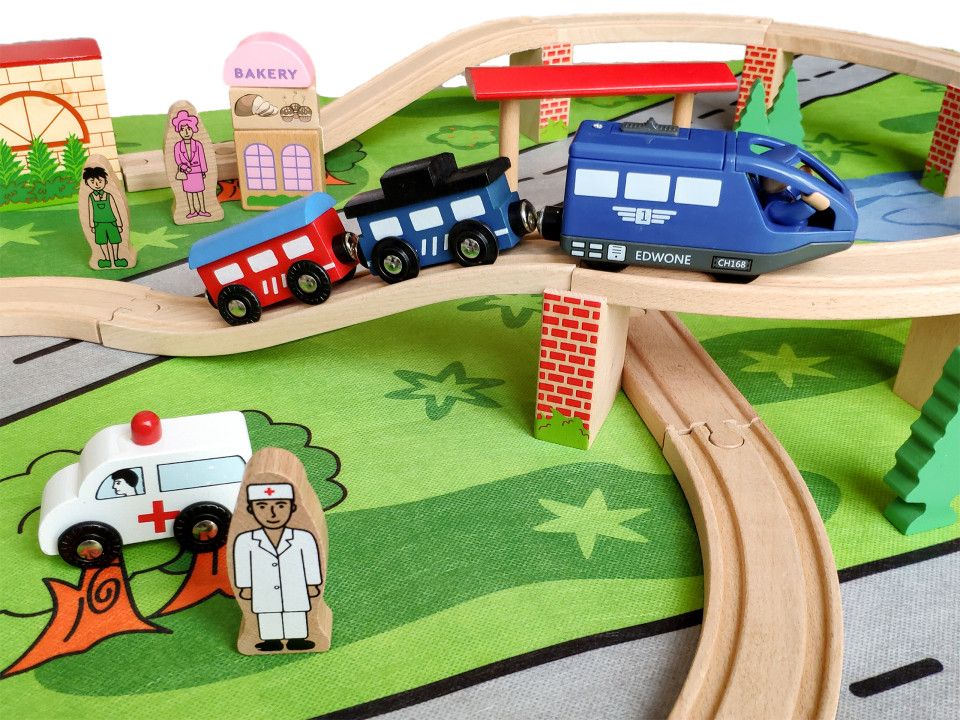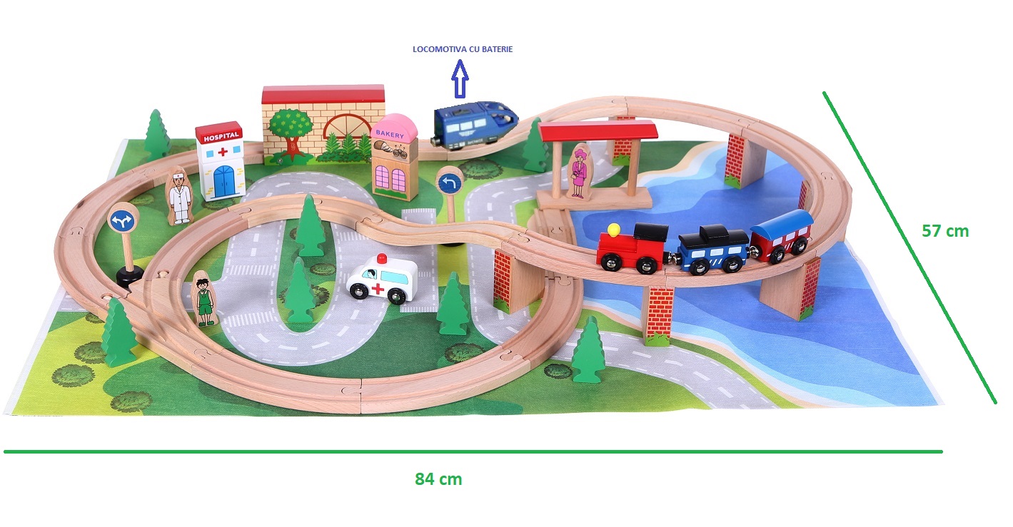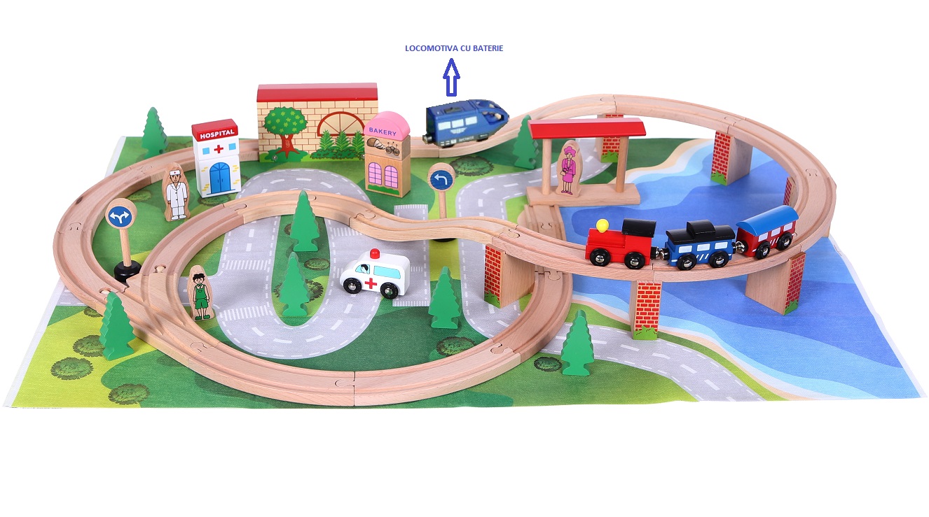 Set trenulet din lemn cu Locomotiva Electrica cu Baterie