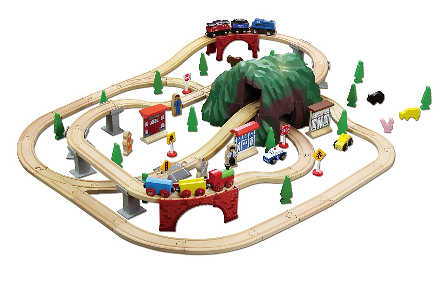 PRODUS : Set trenulete Mountin Rock Town cu circuit montan si tunel dublu Rail Road 100 piese din lemn