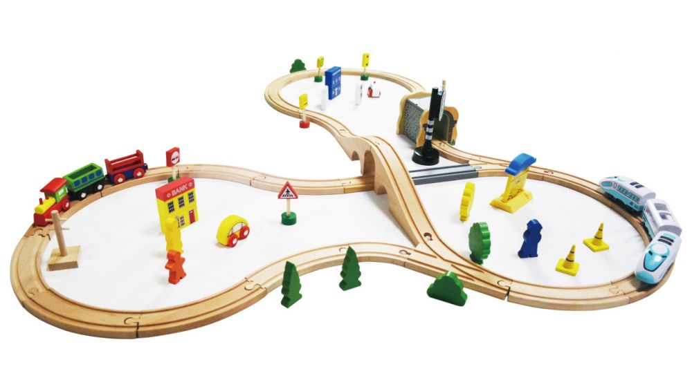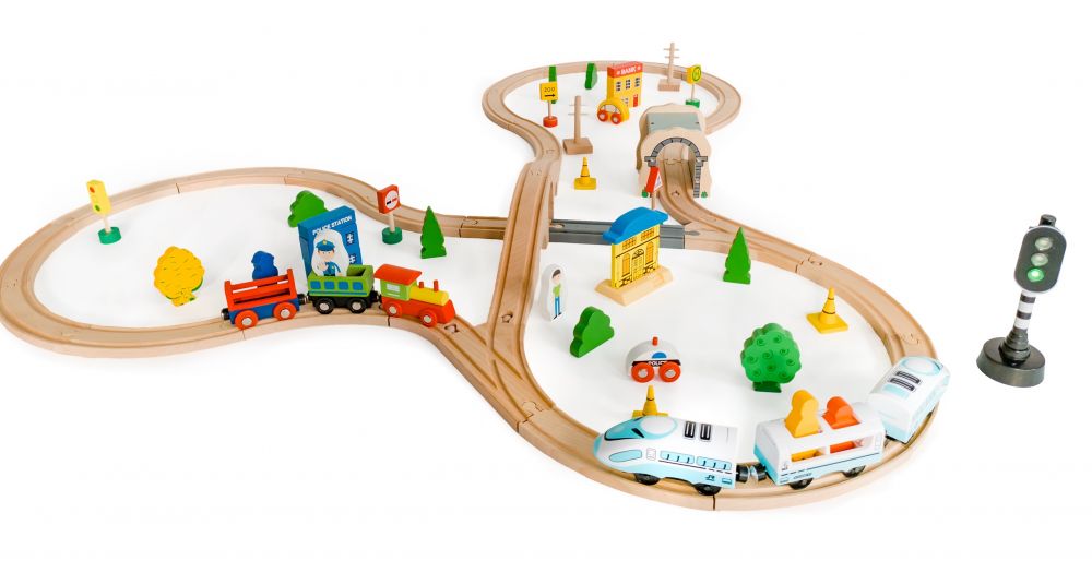 ♦ Setul contine 69 de piese, printre care: 2 seturi de trenulete cu vagoane set de sine, un tunel, figurine, tufe, copaci, clădiri, o masina, etc