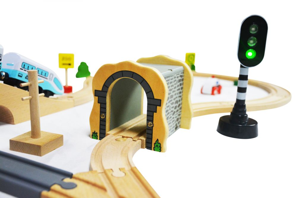 Set trenulete din lemn cu Sunete si Lumini cu Locomotiva Electrica cu Baterie si Semafor cu LED-uri