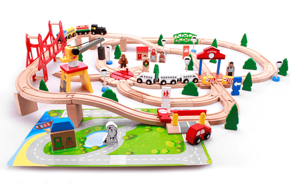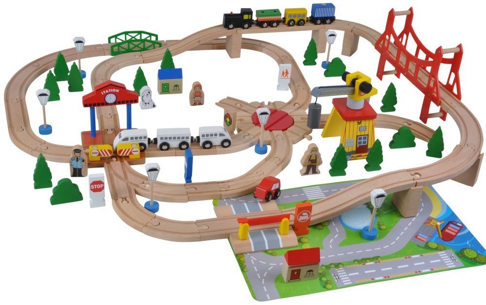 Produs: Set sine, trenulete, accesorii : Wooden Train Set - pe doua nivele.