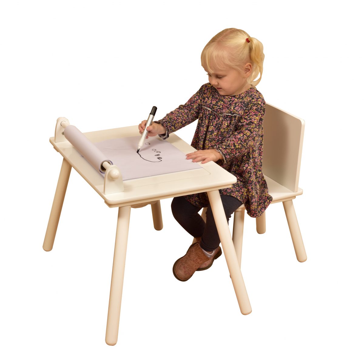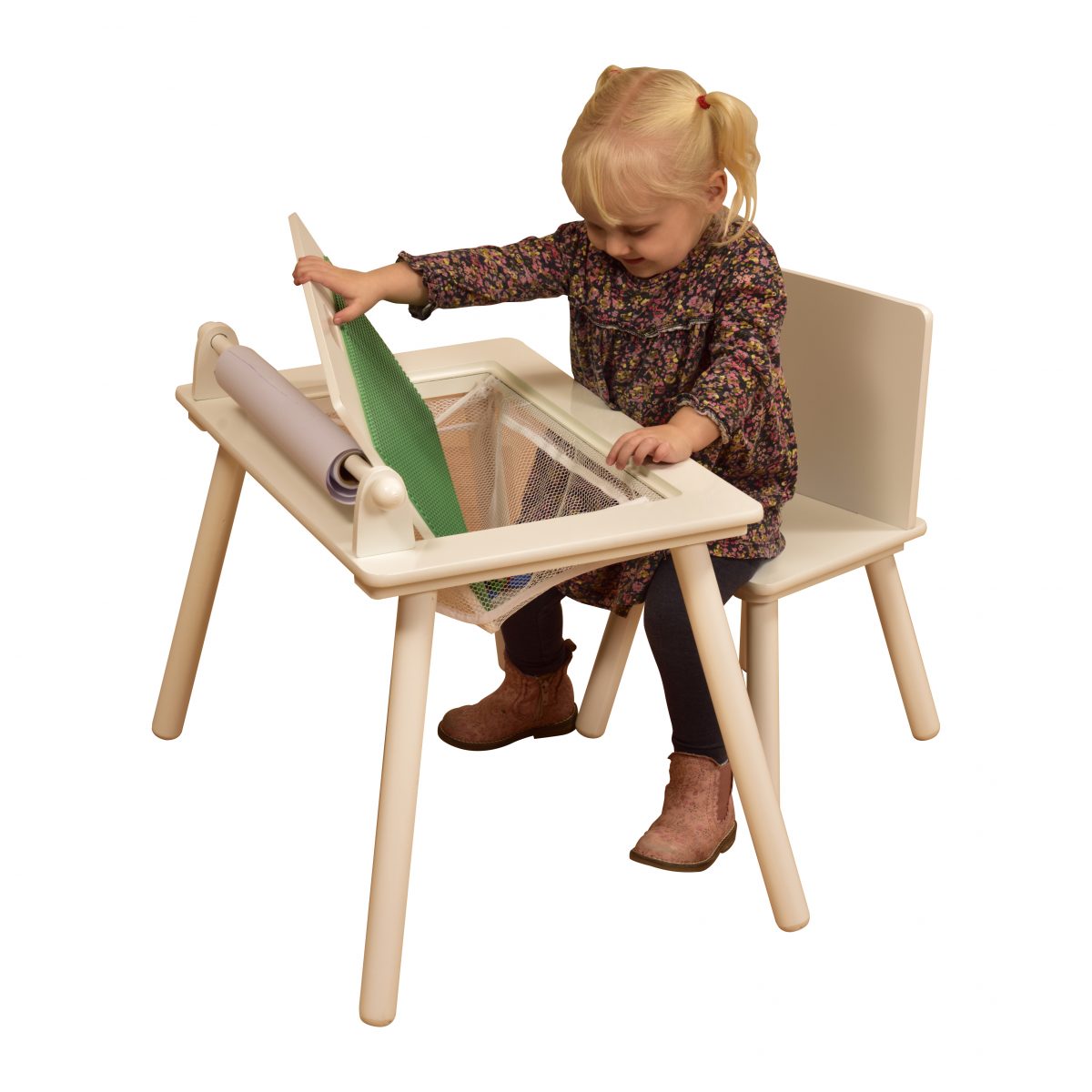 O masuta versatila pentru multiple activitati, speciala pentru desenat pe rola de hartie, precum si pentru joaca cu piesele Lego, care se pot aseza pe placa de LEGO integrata pe masuta, facilitand stocare peiselor in spatiu sepcial destinat pentru stocare sub masuta, datorita capacului detasabil.