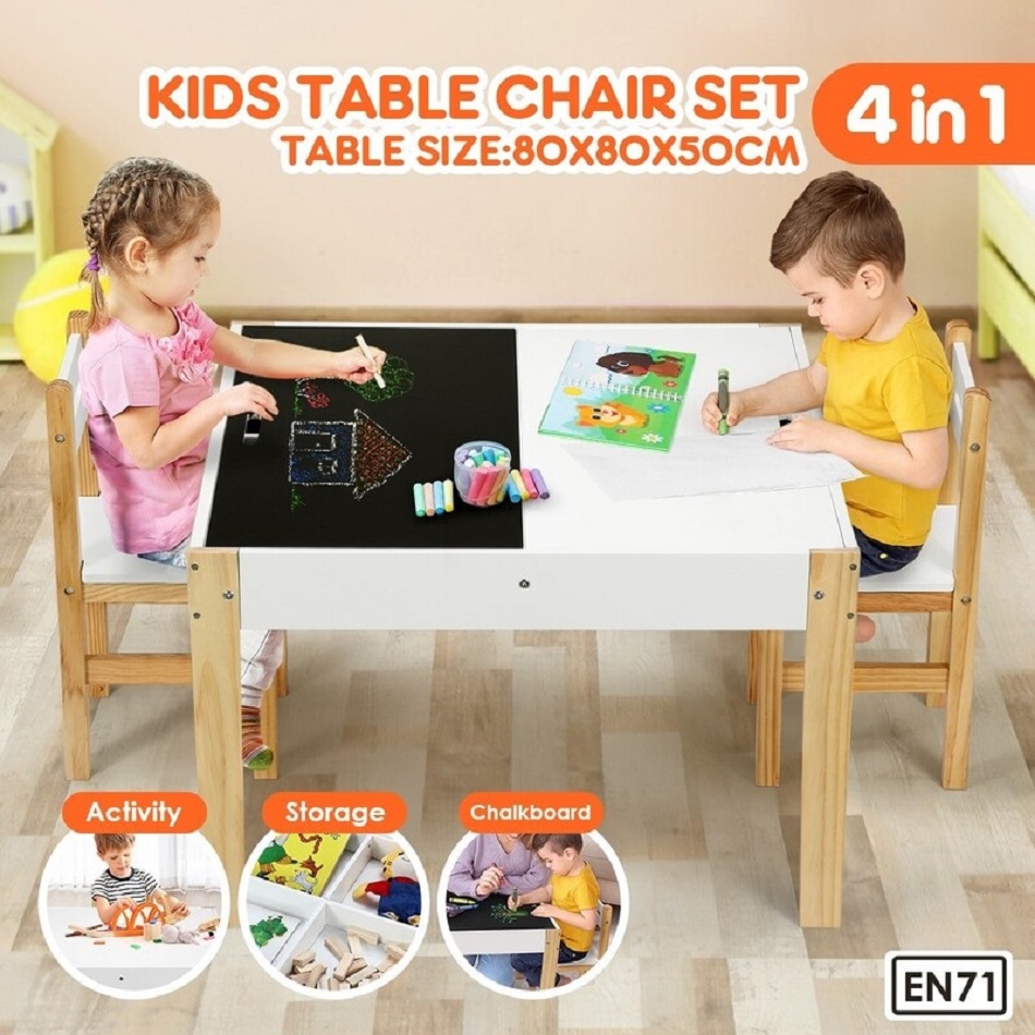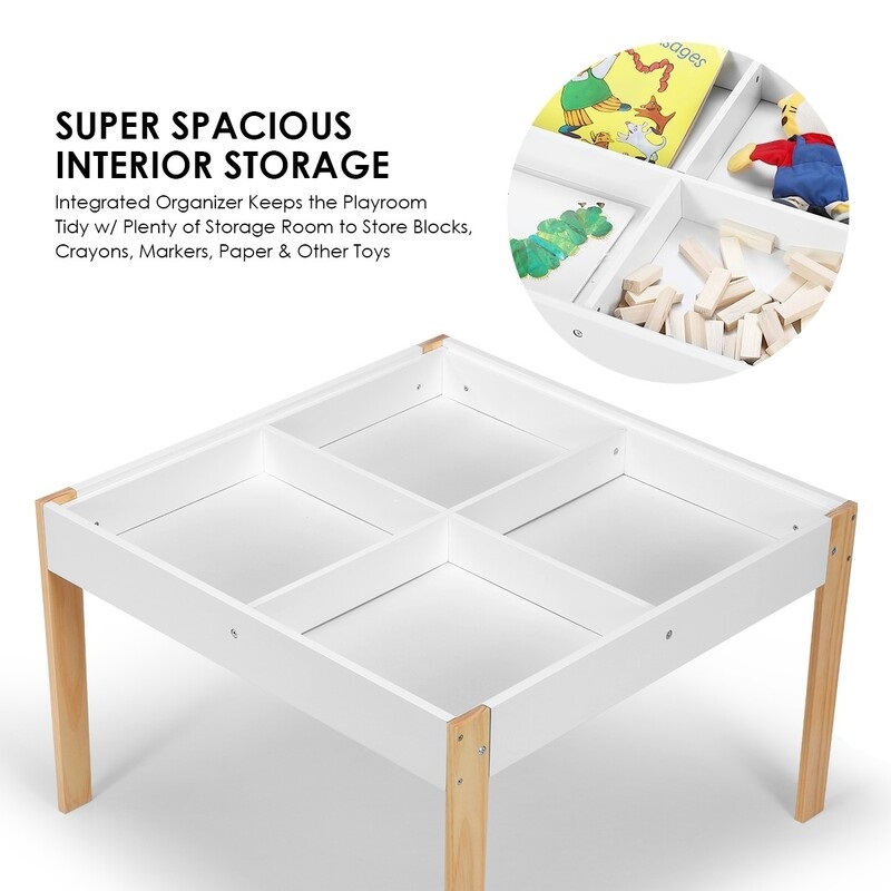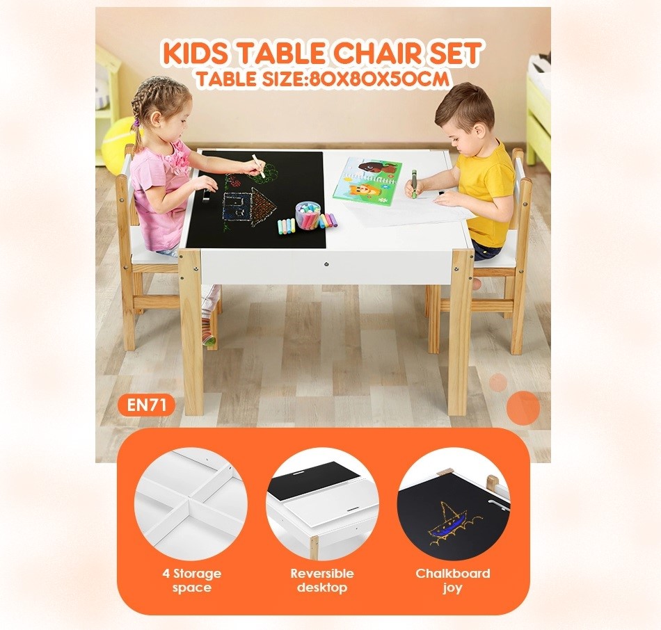 Produs: Masuta cu 2 Scaune, Top Detasabil, Tabla de scris cu Creta si cuburi din lemn incluse, Masuta cu 4 zone Compartimentate de depozitat, Picioare Solide din Lemn masiv de Pin, Blat din MDF, 2 Scaune cu SPATAR, Design Modern