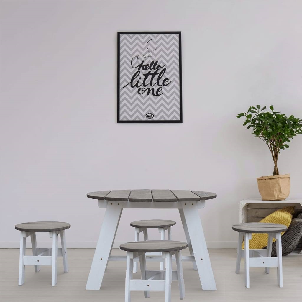 Setul Picnic din 5 piese Round gri/alb de la AXI nu este doar la îndemână, ci și cu bun gust pentru grădina sau interiorul tău. Această masă rotundă din lemn și scaune sunt foarte robuste și potrivite pentru tineri și bătrâni. Atât masa, cât și scaunele pot suporta o greutate maximă de nu mai puțin de 100 kg. Setul poate fi extins cu setul de picnic din 2 piese de la AXI, astfel incat tu sau copiii tai sa stai impreuna cu si mai multi prieteni sau familie. Datorită tonurilor neutre de gri/alb, acest set se potrivește în aproape orice interior. Potrivit pentru copii de 18 luni și peste. De asemenea, plăcut de combinat cu una dintre căsuțele de la AXI.