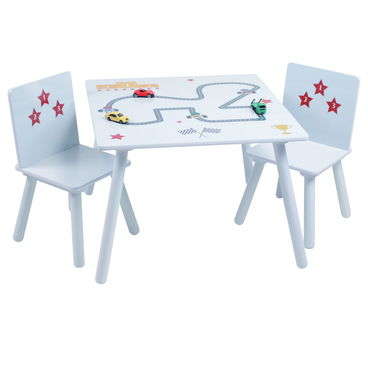 - Pregătește-te pentru cursă! Set clasic de masă și scaun albastru decorat cu pistă de cursă și stele.