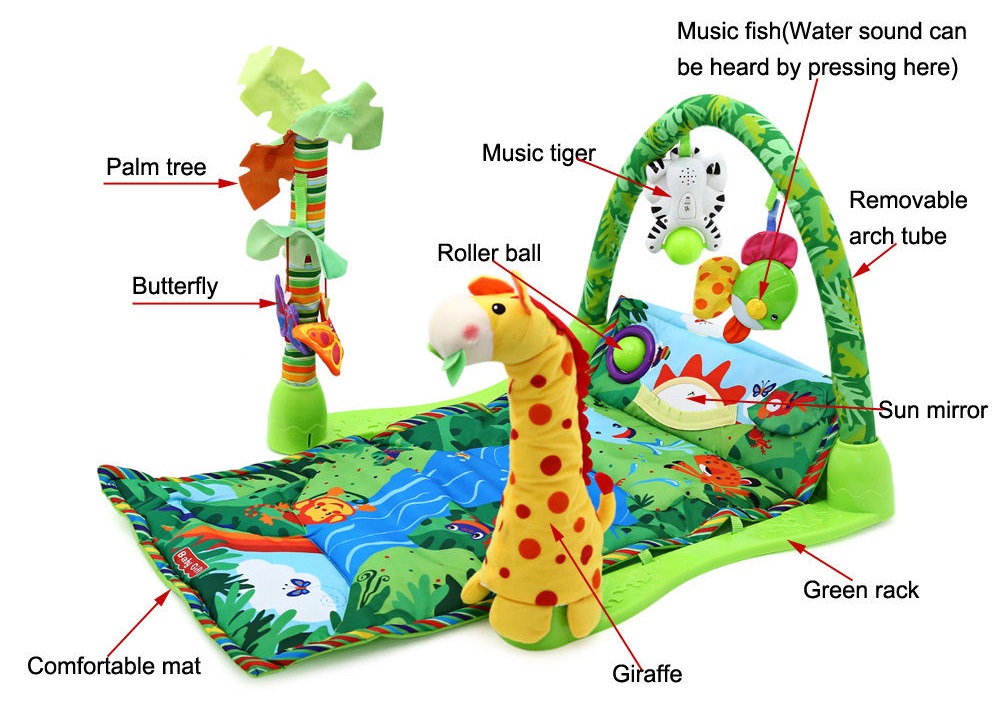 - arcada, palmierul si girafa se pot detasa si monta fie la mijloc, fie pe margine, iar jucariile se pot detasa,